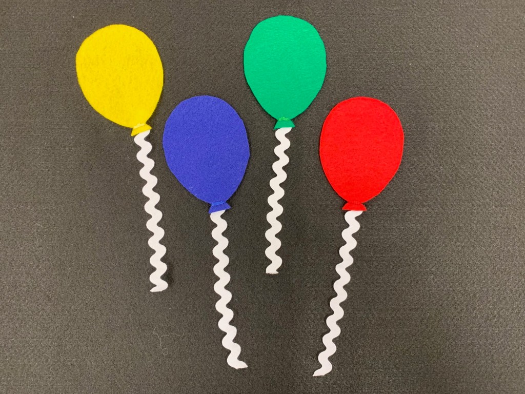 To make the balloons I enlarged a clip art picture of a balloon using Microsoft Word and used it as a template to cut out the balloons. Then I sewed rick rack on as string. I think the rick rack is what really makes it cute.