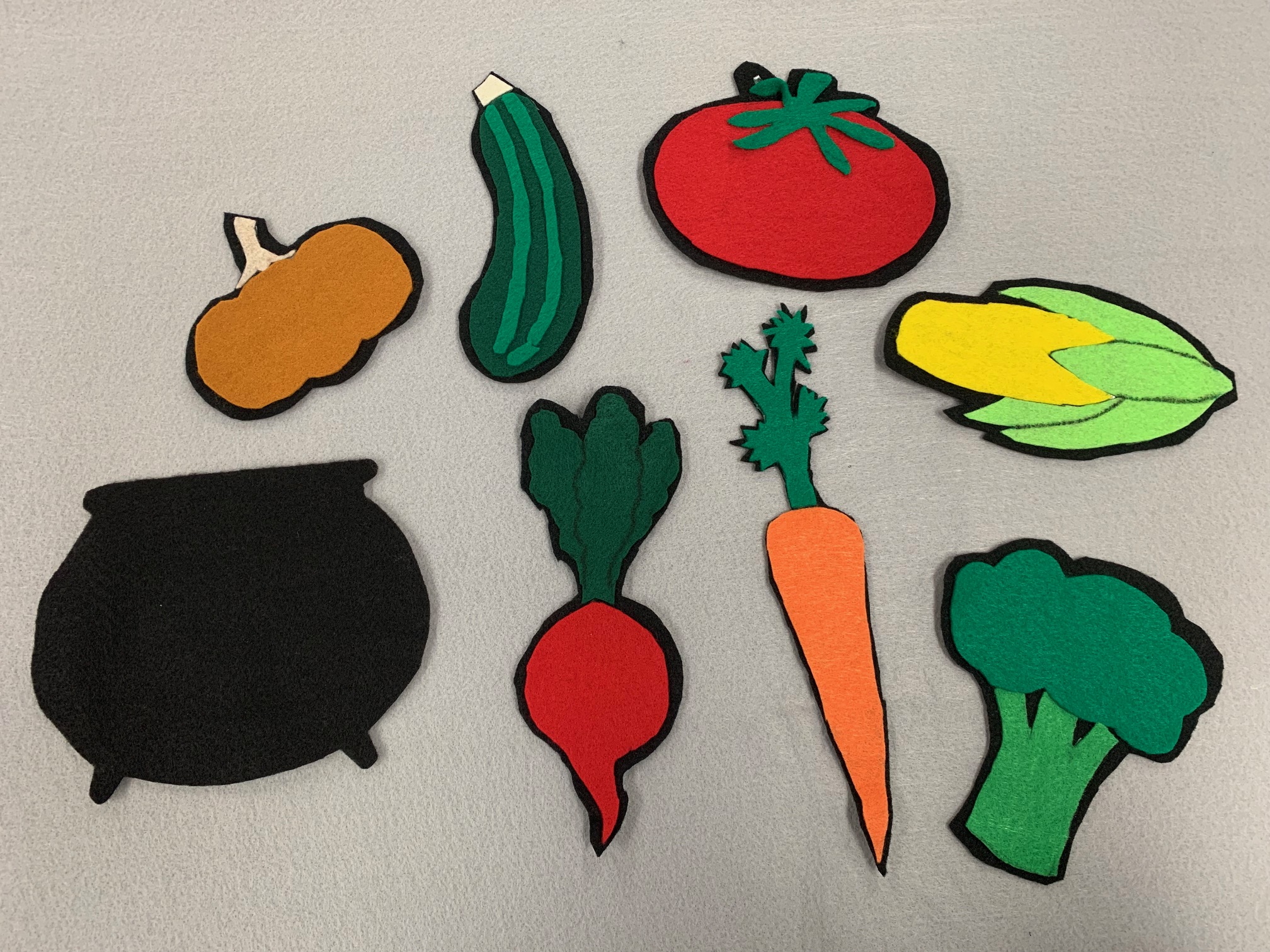 Inspiration for this flannel board came from Flannel Board Fun. Kids love calling out the name of the vegetables as I hold them up as well has to pretend to help stir the soup pot.