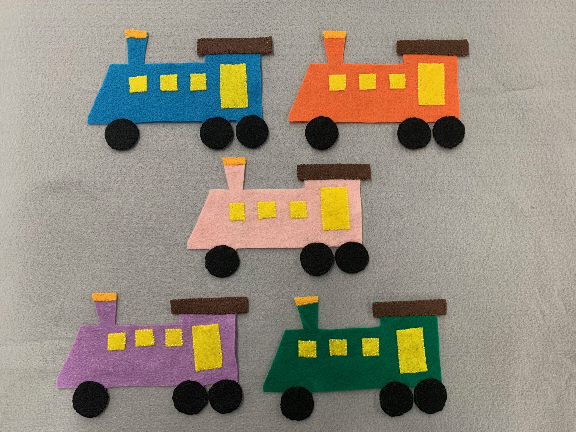 I found this flannel board on The Storytime Lady’s post on her train storytime. I loved that I could easily make trains in various colors that would appeal to babies. The melody is simple enough that parents quickly join in singing along. The trains came from clip art that I found and rendered in felt.