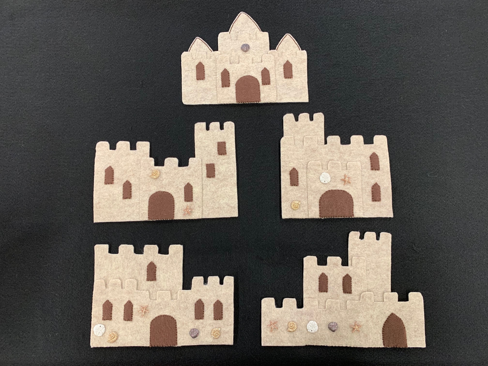 Ocean and beach related storytimes are some of my favorite since there is such a rich variety of materiel to select from. I got the verse for “Five Pretty Sandcastles” from Katie at Storytime Katie. I did alter the words slightly from “the tide came in” to “the wave came crashing” since I though it would be a bit more accurate and understandable for preschoolers. I took my cue for the sandcastles from Stephanie at Imagine Our Life. She had designed a quiet book page about sandcastles. The seashells are all buttons.