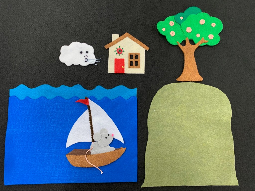 In my quest in finding flannel boards that included boats I saw saw mention of turning the short story “The “The Mouse and the Winds” into on. It is one of the short stories included in Arnold Lobel’s book “Mouse Tales.” I like how the story builds upon itself every time the wind blows mouse’s boat. The tree is double sided. One side is plain and one side has flowers so that you can flip it over as needed during the story.