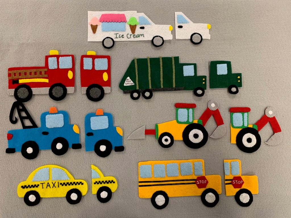 “The Bus for Us” is written by Suzanne Bloom. I am certainly not the first person to have retold the story in flannel board form. Most of my vehicle patterns came from Learn Create Love. There are a ton of craft patterns that translate well into felt. The people came from an Etsy shop called My Dollies By Nettie. For all the vehicles I made a front section that I put up on the board first so that the kids can guess what the vehicle is. I then switch it out for the full sized vehicle.