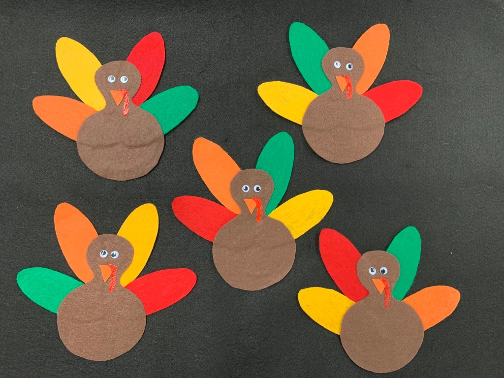 I picked up the rhyme for “Five Little Turkeys” on DLTK’s website. It has been a number of years since I have made this set so I can’t remember what I used for a pattern. I did make sure that each turkey was unique. The color order of the feathers is different for each bird. I usually pick a handful of kids to come up and help put the turkeys on the flannel board before starting the rhyme. They love to help out!