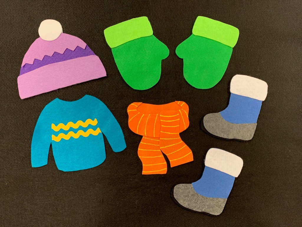 This flannel board I copied from Wendy at Flannel Board Fun. The set has pieces for articles of clothing for cold weather as well as for rain. I’ve included the cold portion here. It is sung to For He’s A Jolly Good Fellow. Since the tune is simple, is is easy for kids to pick up on and join in.